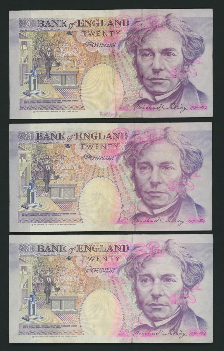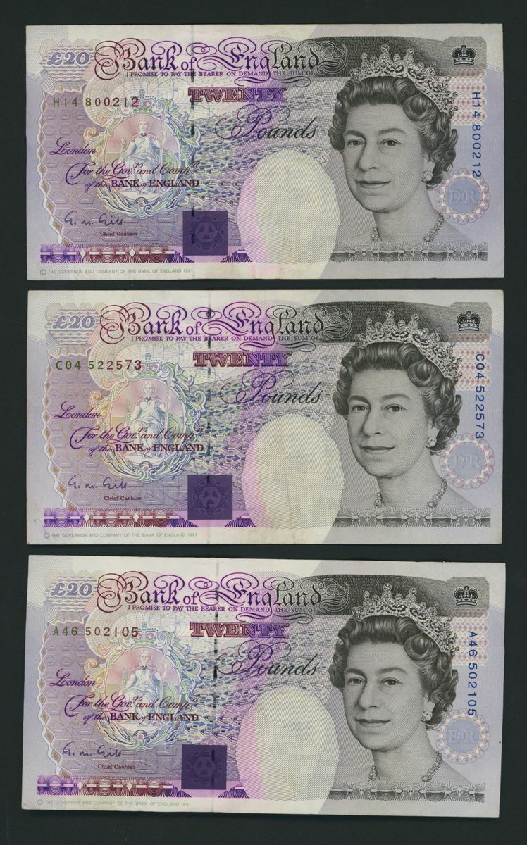Bank of England, [3 notes] error notes, £20, ND (1991) G. M. Gill, printed with extra ink and ink transfer to reverse, nos. A46 502105, C04 522573, and H14 800212