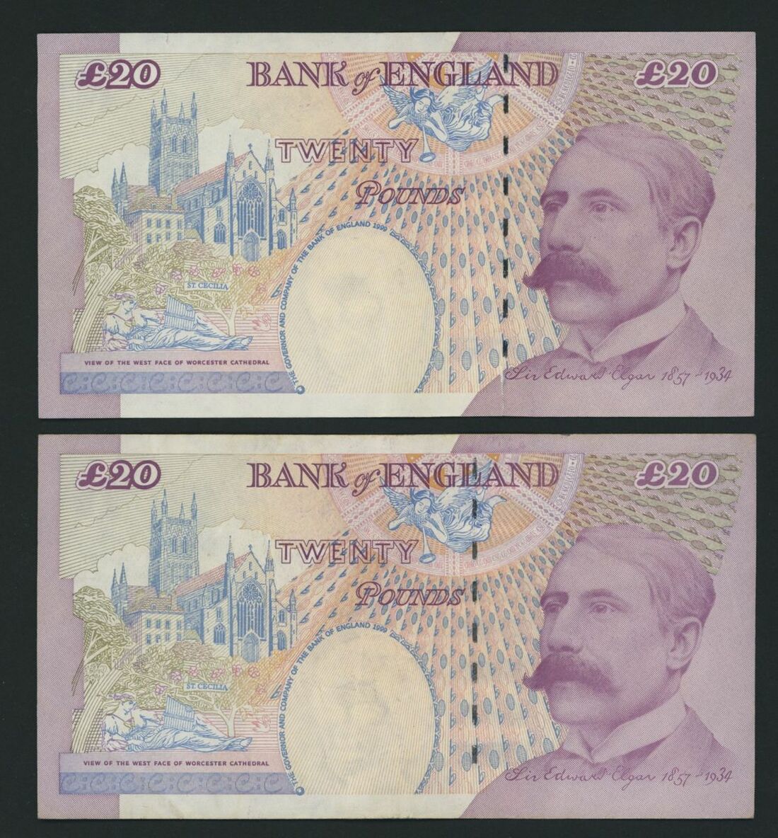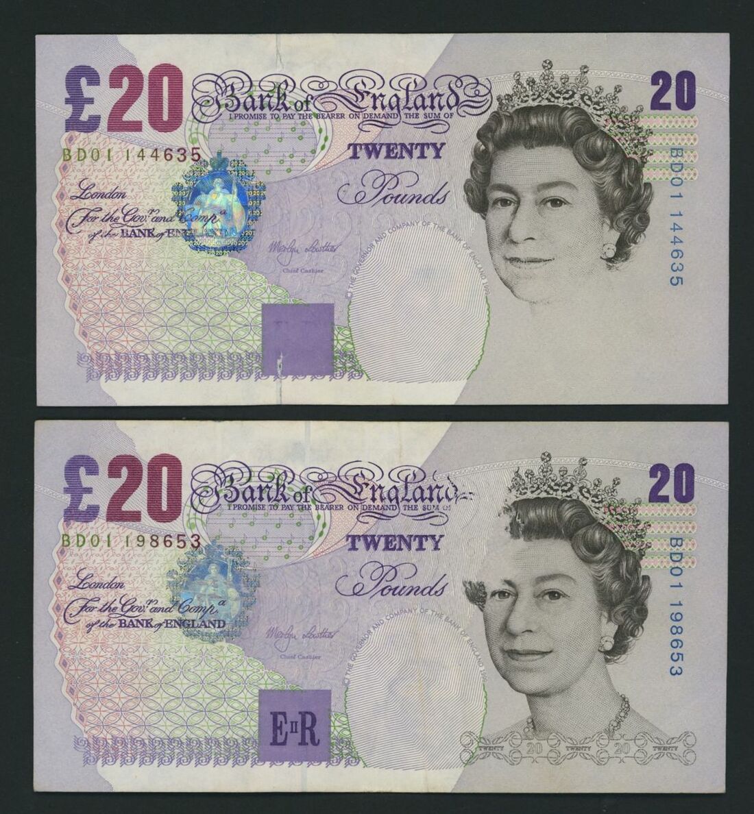 Bank of England, [2 notes] error notes, £20, ND (1999) M. Lowther, mis-printed with details missing by Queen's head, nos. BD01 144635 and BD01 198653