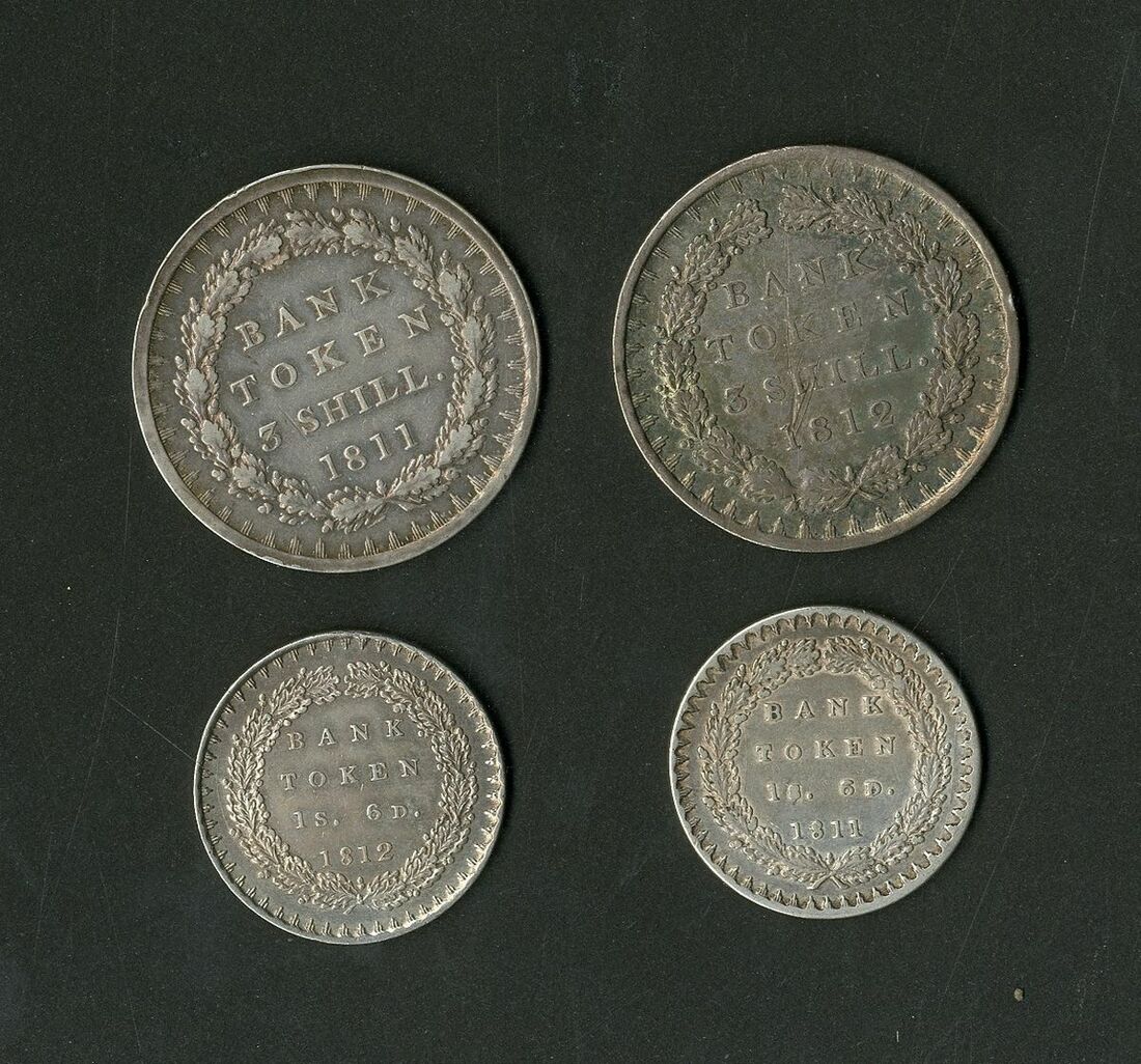 Bank of England, [4 coins] 3 Shillings, 18 Pence, 1811-1812, Bank of England first type Bank Tokens,