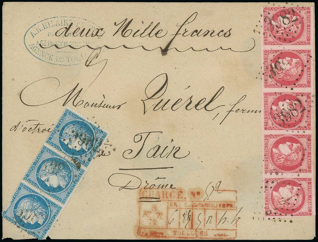 1872 (9 Feb.) letter from Cette a Tarascon addressed to Tain, Drôme insured for two thousand francs and bearing 1870 80c. horizontal strip of five and 1871 25c. horizontal strip of three each cancelled by "3982" in lozenge of dots obliterator, the reverse with despatch, transit 'Marseille a Lyon' (9.2) and arrival datestamps, minor peripheral imperfections and wax seals removed from the reverse not detracting from the overall appearance. A most attractive showpiece item. Spink Maury 49 (unpriced as strip of five). Photo