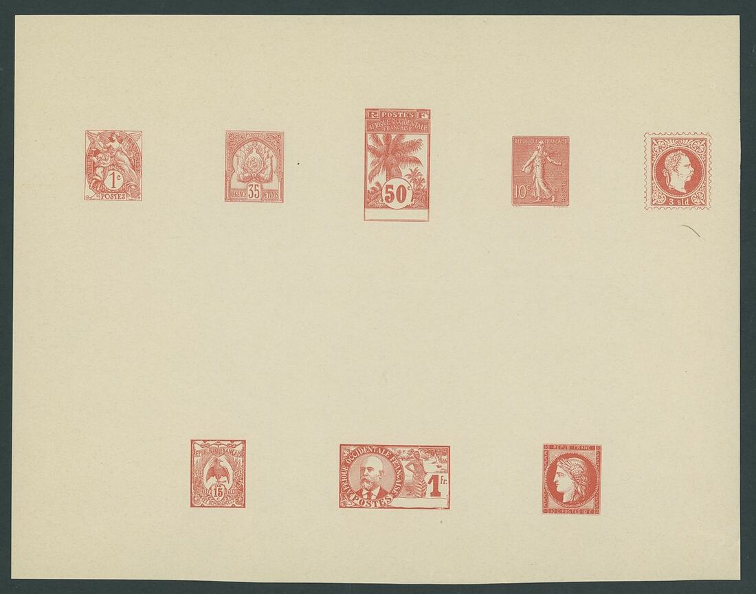 1905 (circa) Collective proof sheet printed at the 'Atelier des Timbres Poste' using the original cliche' from the workshop and others provided by Arthur Maury from his catalogue (France 10c. Cérès and Lombardy Venetia 3s., both retouched in the Atelier), in order to carry out ink tests as a part of research into shades for the issue of 'Semeuse' lined type stamps. Fine and rare. Brun certificate (2018).