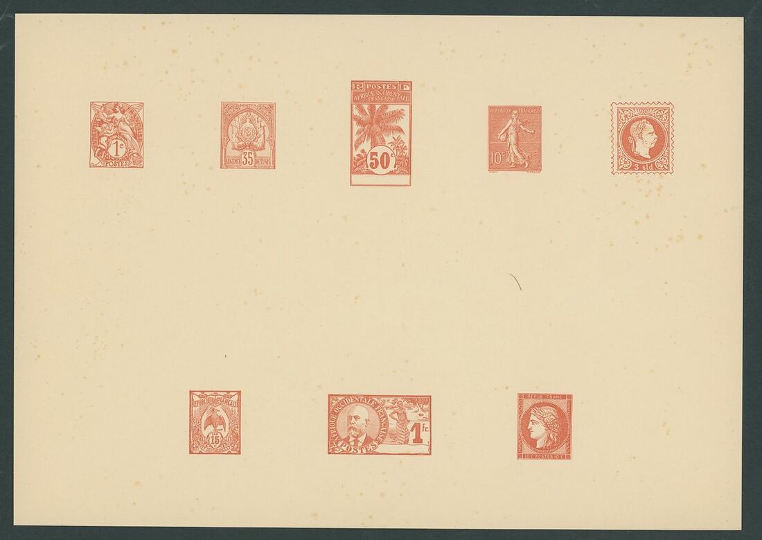 1905 (circa) Collective proof sheet printed at the 'Atelier des Timbres Poste' using the original cliche' from the workshop and others provided by Arthur Maury from his catalogue (France 10c. Cérès and Lombardy Venetia 3s., both retouched in the Atelier), in order to carry out ink tests as a part of research into shades for the issue of 'Semeuse' lined type stamps. Overall toning, still an interesting piece of printing history.