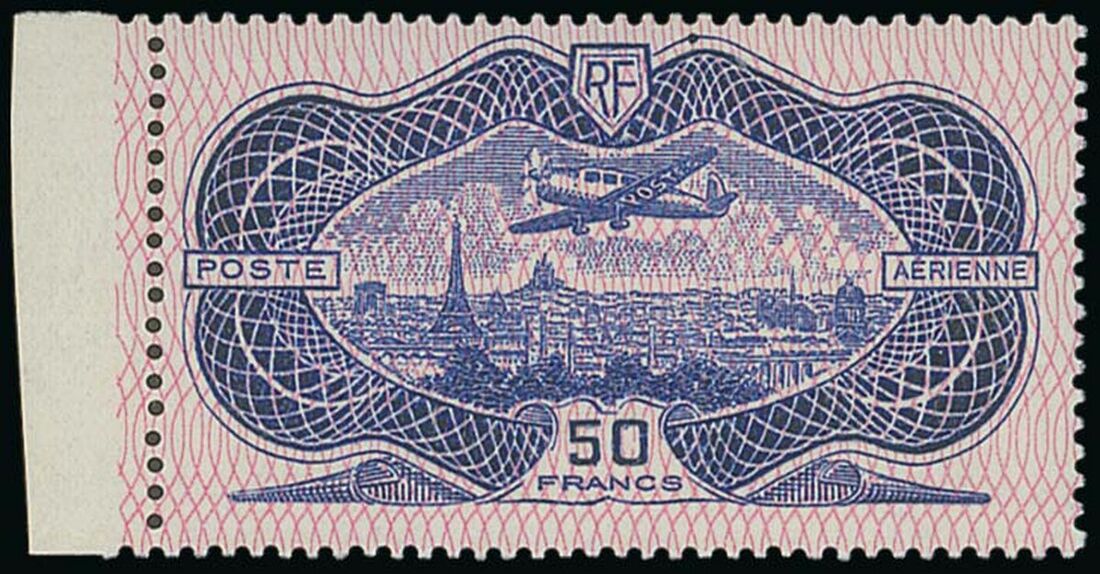 1936 Aeroplane over Paris 50f. burelé from the left of the sheet; unmounted mint with off-white gum; fine and attractive. Spink Maury 15, €1,700