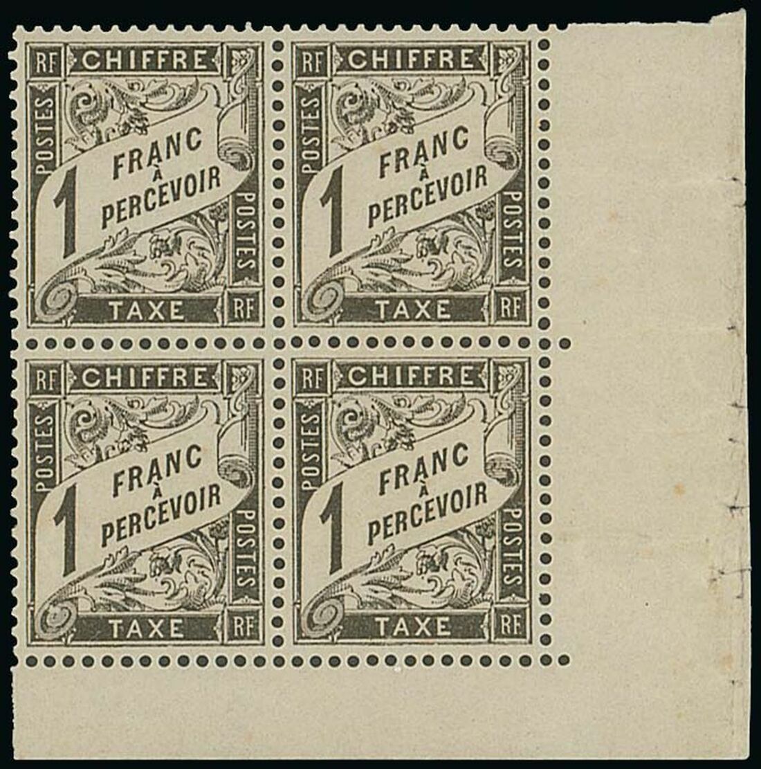 1881-92 1fr. black lower right corner block of four, unmounted mint original gum, mounted in lower margin only, some usual gum creasing otherwise very fine and rare. Spink Maury T22, €7,000. Photo