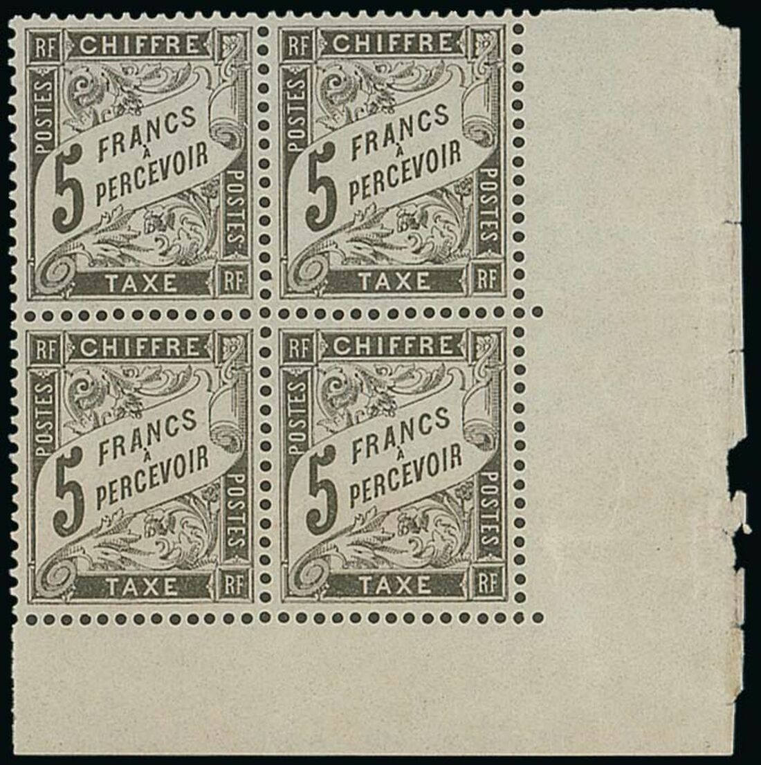 1881-92 5fr. black lower right corner block of four, unmounted mint original gum, very fine and scarce. Spink Maury T24, €22,500. Photo