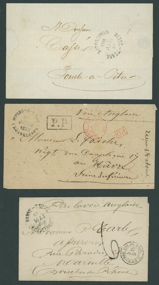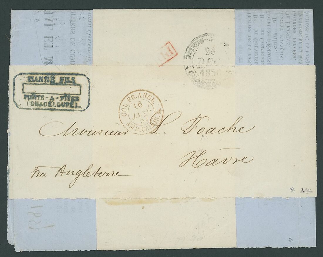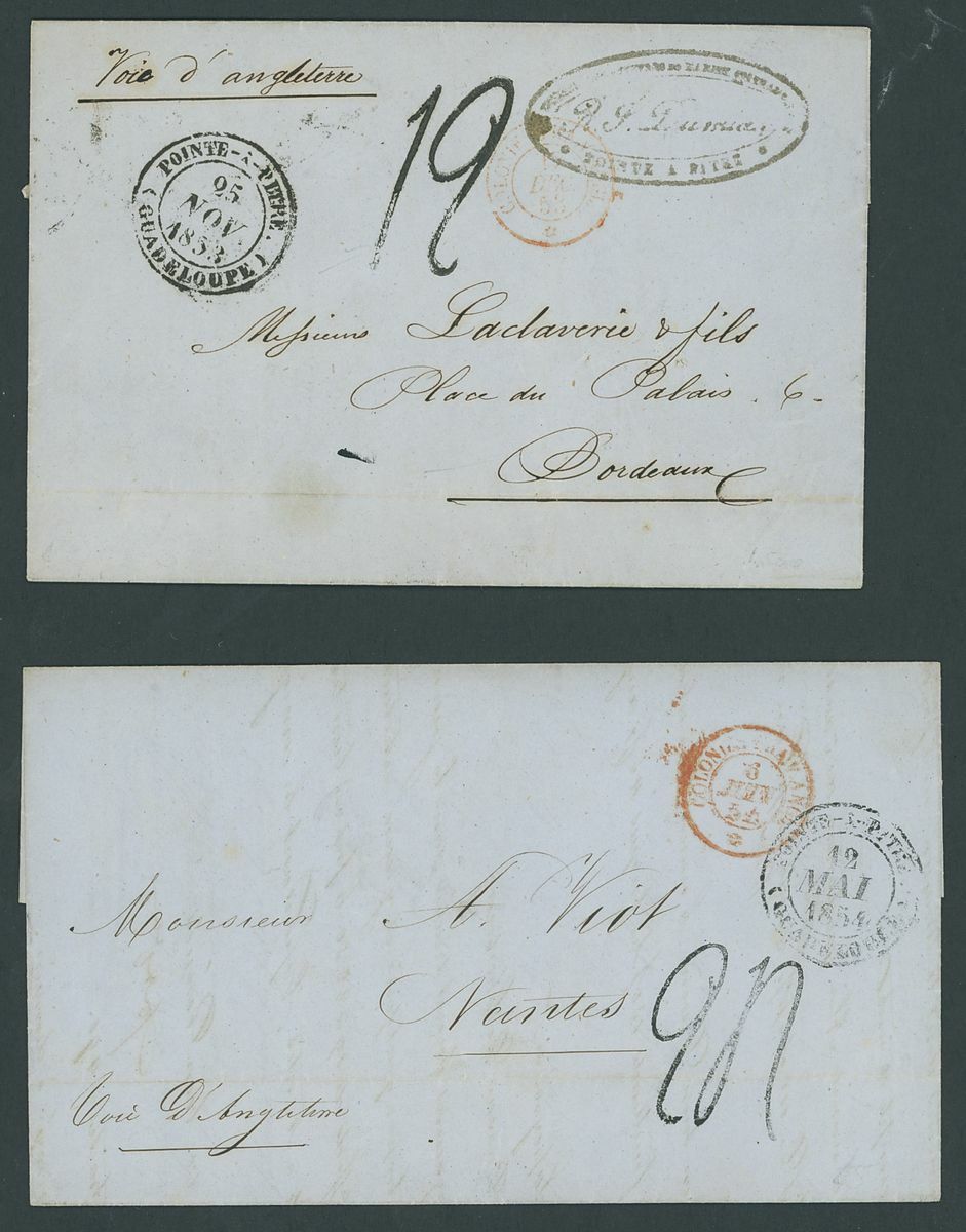1817-1863 stampless postal history selection (7) including 1817 (28 March) Official Printed Decree from Basse Terre to St. Pierre (Martinique) with Official cachet on the front; 1856 (28 Dec.) bulletin to Le Havre (one of the finest of the few examples of stampless printed matter mail known folded), with Pointe a Pitre datestamp, red framed