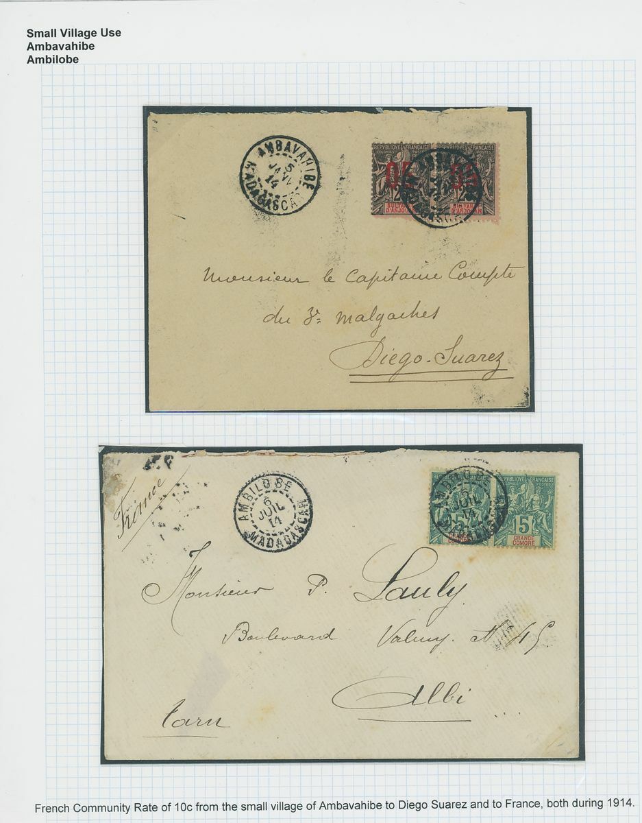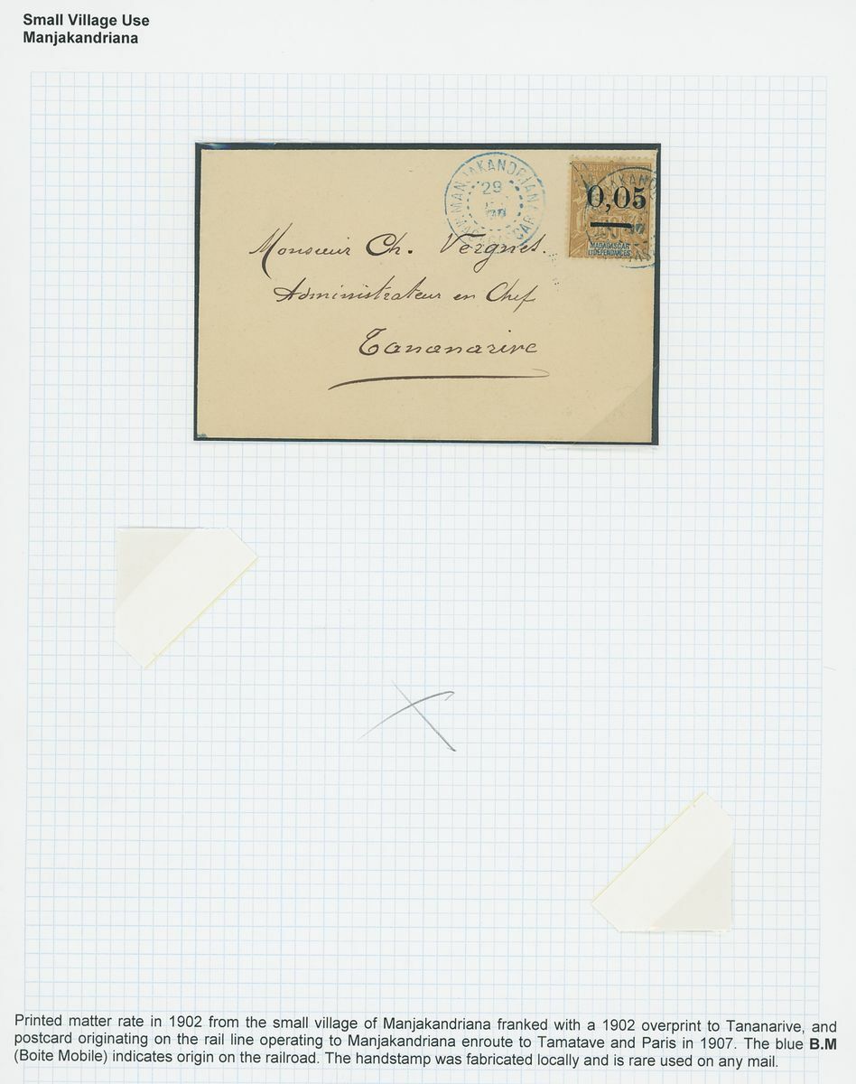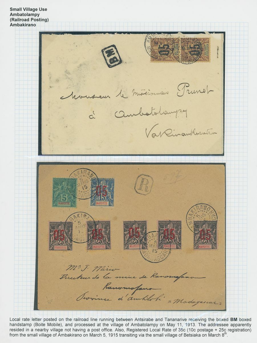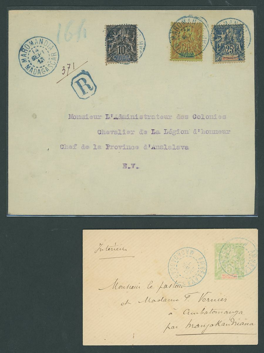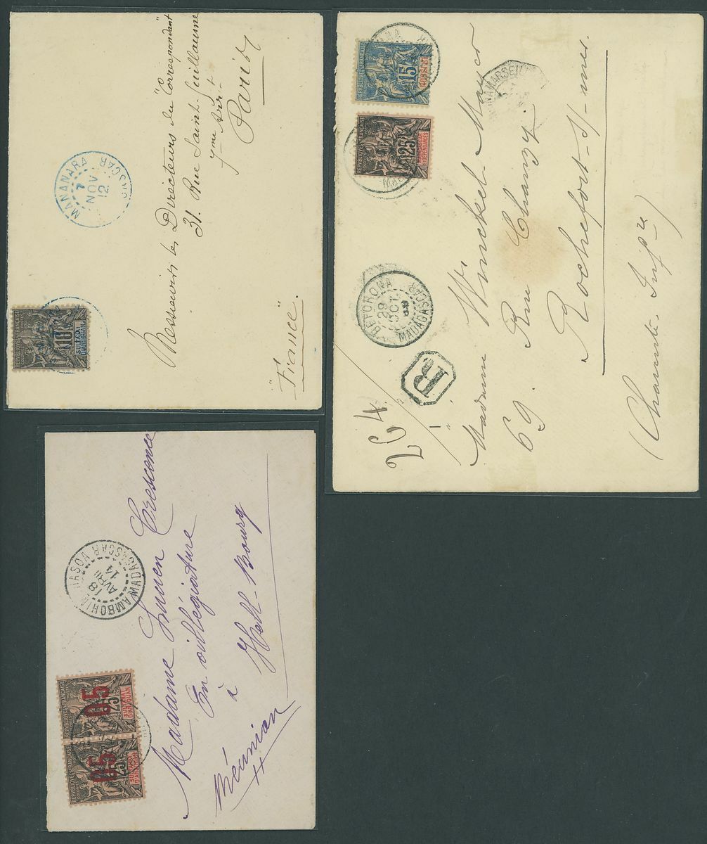 1899-1914 small village usage postal history selection (22) including Ambatolampy, Ambakirano, Ambalavo, Ambavahibe, Ambilobe, Ambohibe, Ambohimahosoa, Andevorante, Antsirabe, Beforona, Camp D'Ambre, Fort Dauphin, Mahevatanana, Mahela, Mananara, Manjakandriana, Maromandia. A great lot for the student of the area.