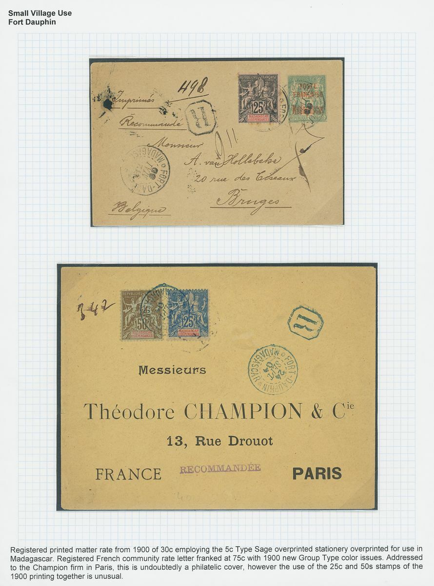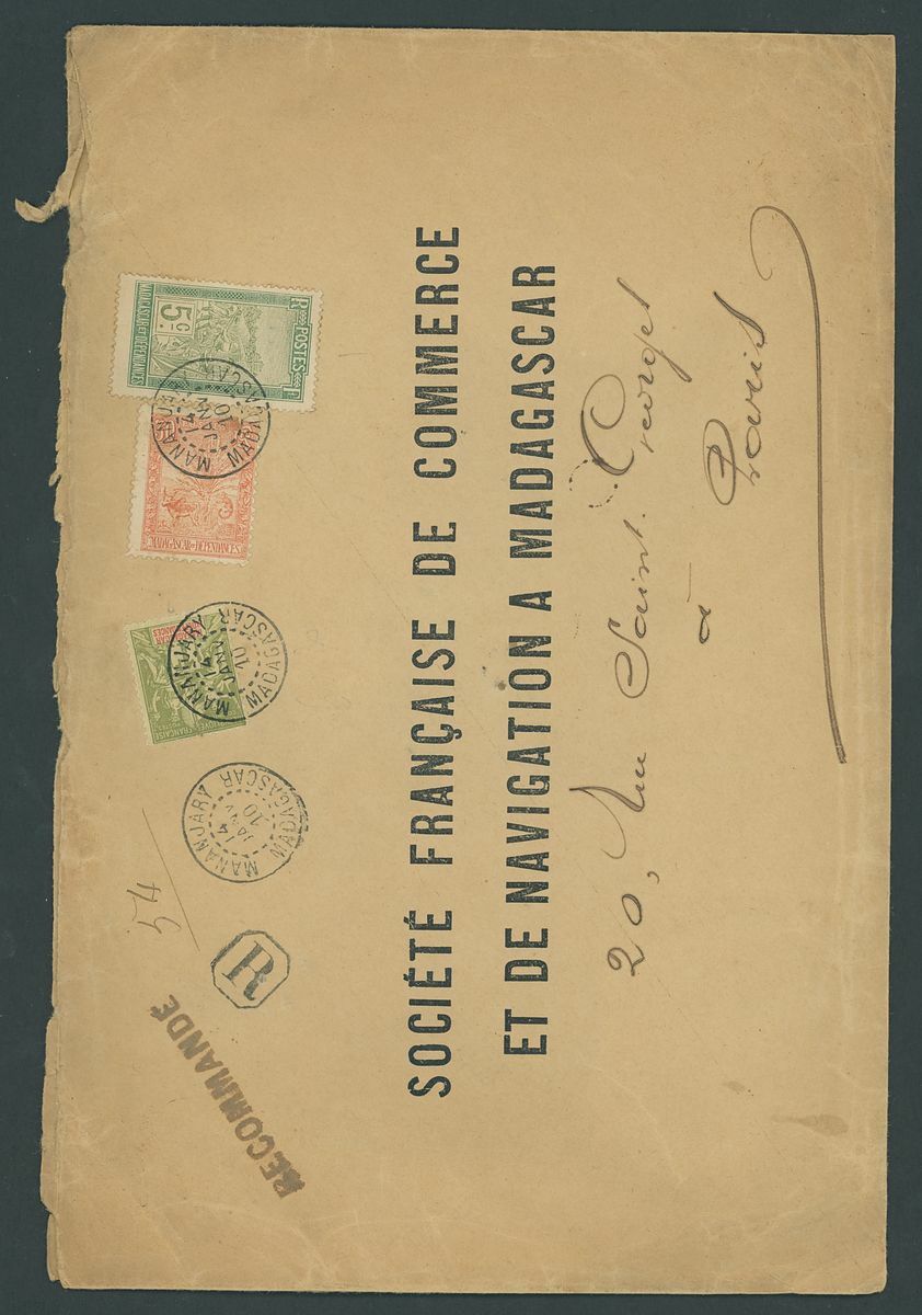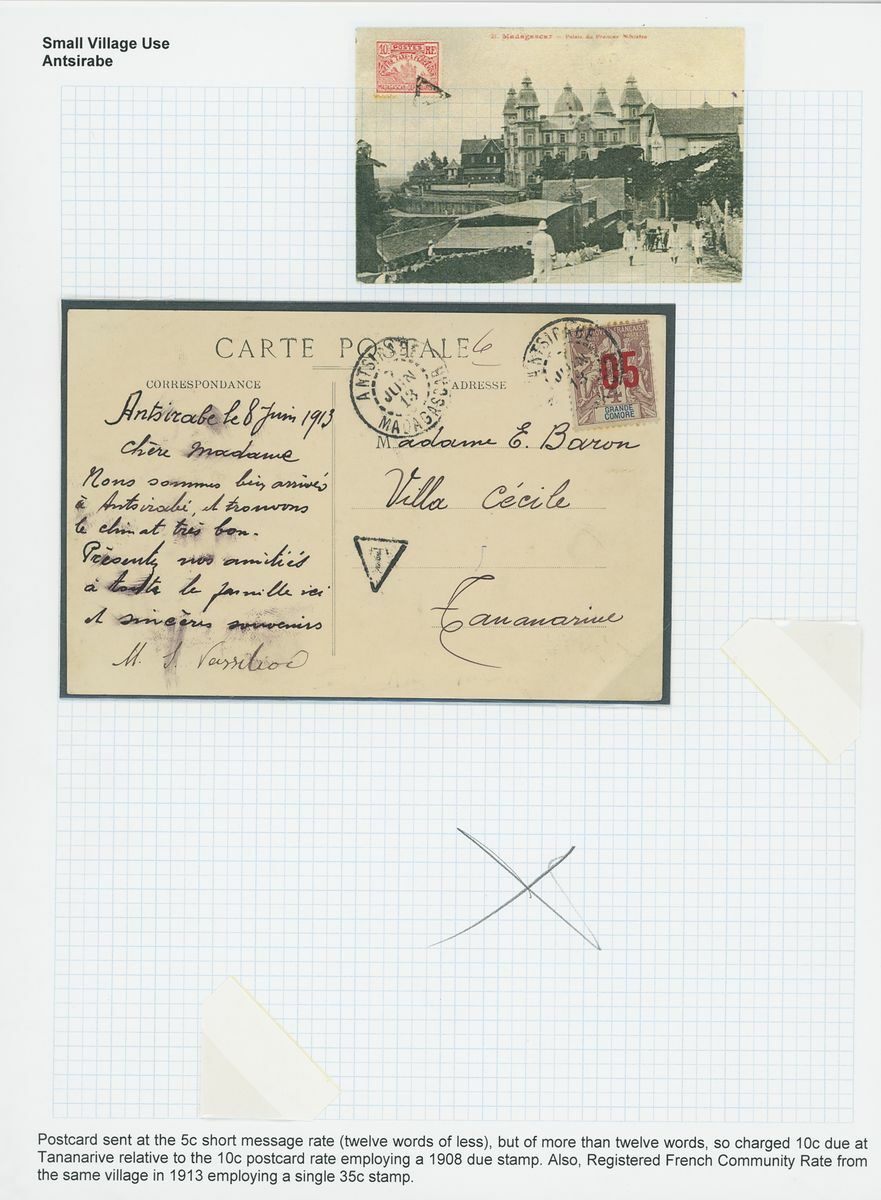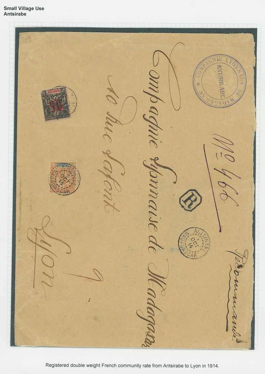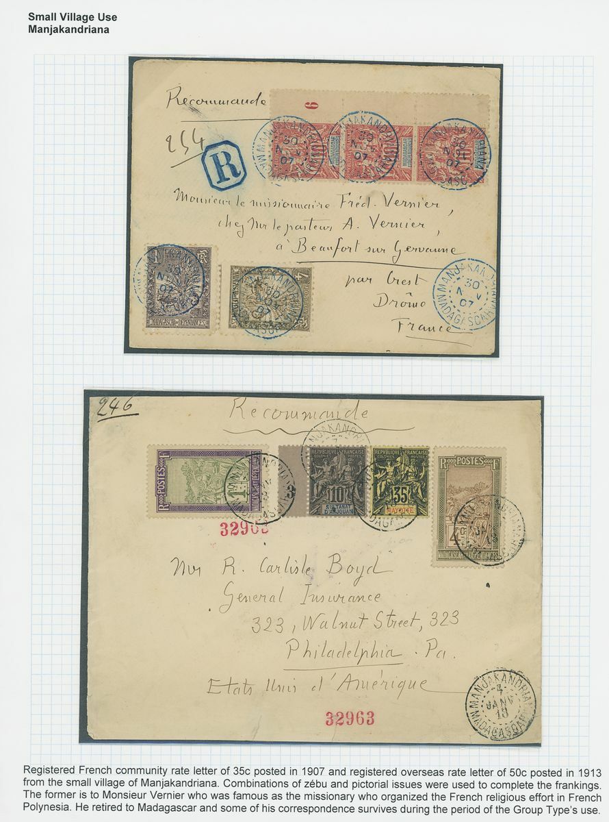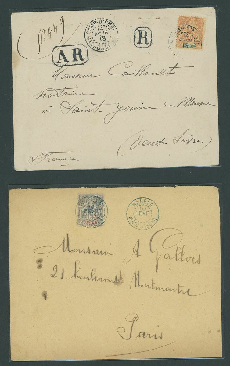 1899-1914 small village usage postal history selection (22) including Ambatolampy, Ambakirano, Ambalavo, Ambavahibe, Ambilobe, Ambohibe, Ambohimahosoa, Andevorante, Antsirabe, Beforona, Camp D'Ambre, Fort Dauphin, Mahevatanana, Mahela, Mananara, Manjakandriana, Maromandia. A great lot for the student of the area.