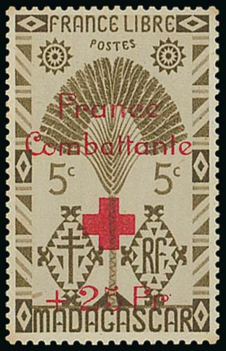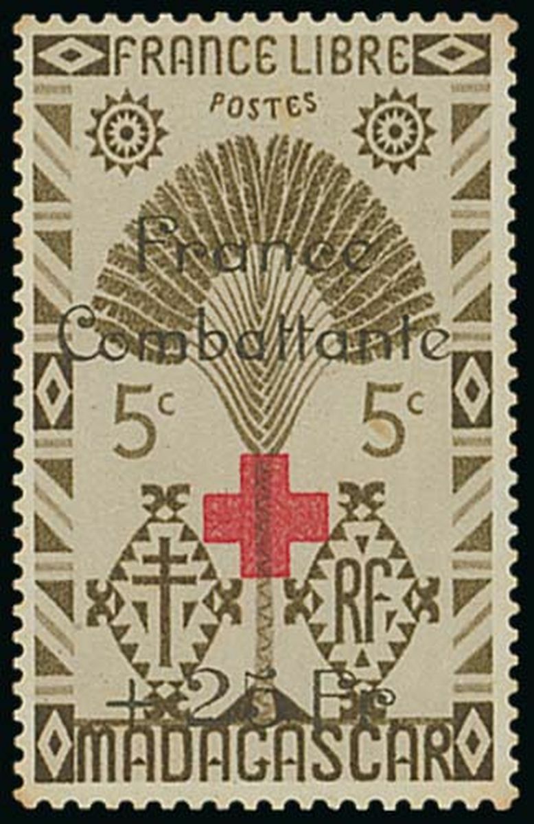 1943 unissued 'France Combattante' surcharges (3) comprising 50fr. in black on 10c. rose-lilac, 25fr. in black on 5c. olive-brown and 25fr. in red on 5c. olive-brown; lightly mounted gum with some foxing marks on the reverse, still good examples of these rare unissued surcharges. Yvert 287b, 287c, 287d, €8,000