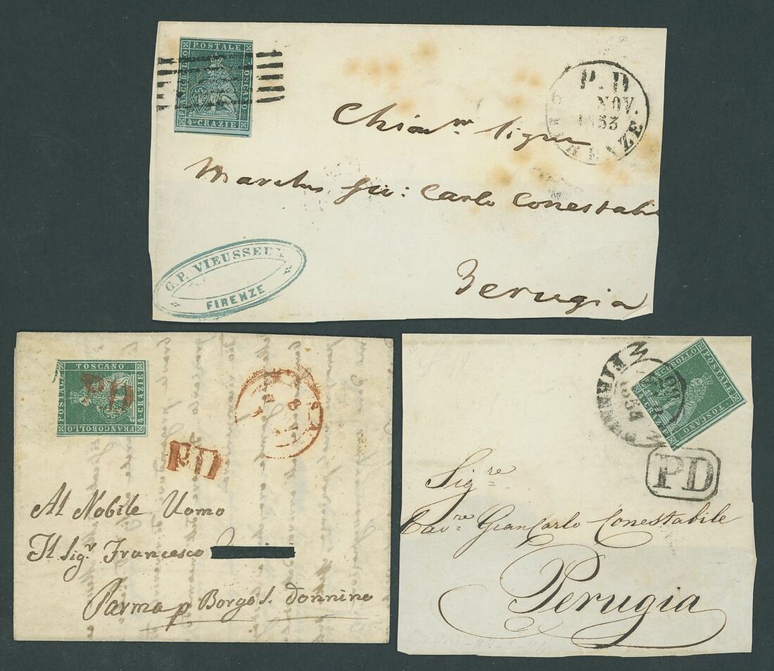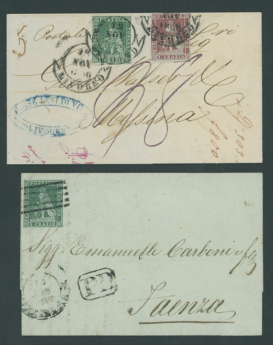 1853-57 three entires and two large pieces franked with the 4cr. of first issue, one of the entire (1856) to Messina bearing also a 1cr., mixed condition. Sassone 13