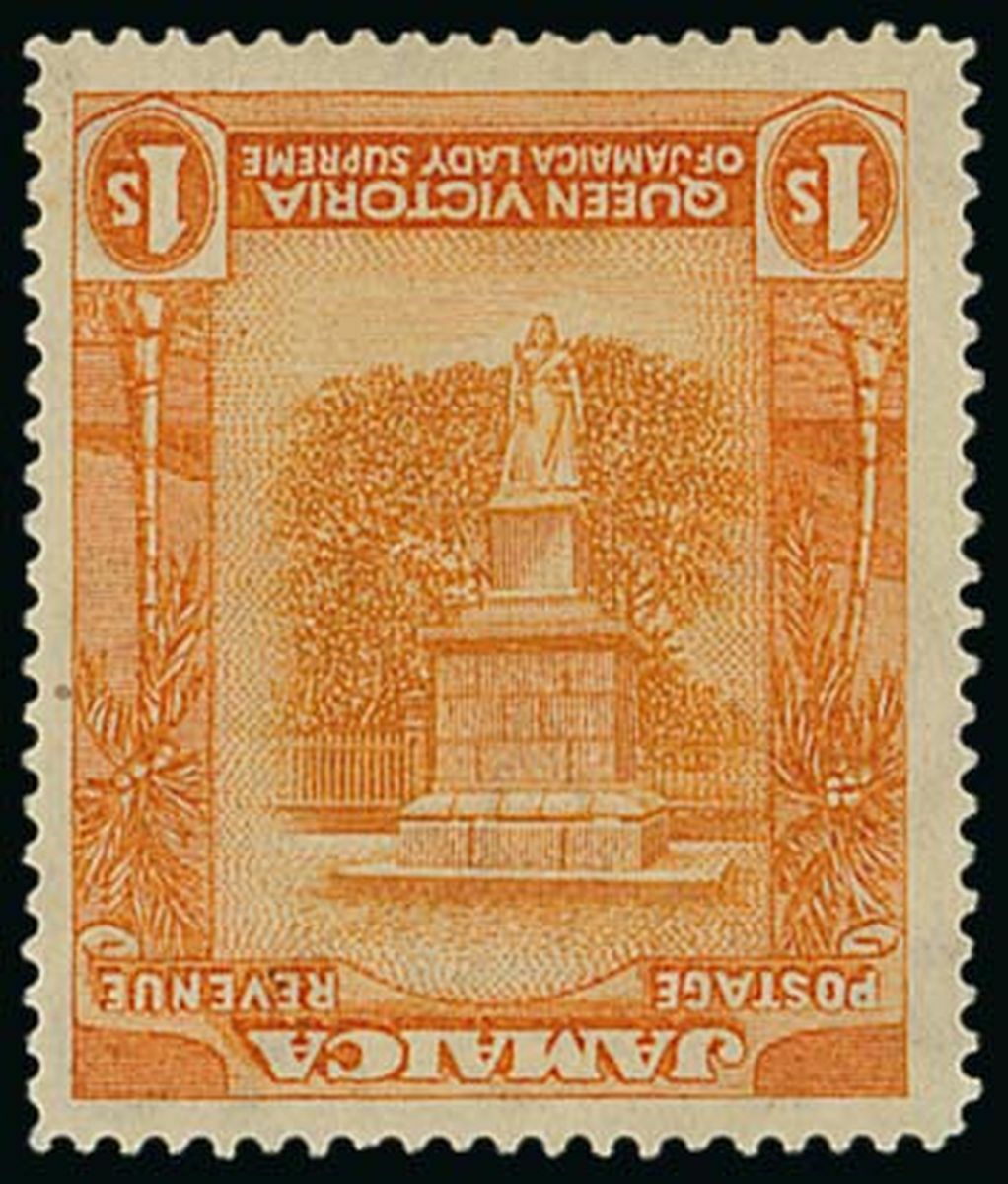 Note: According to most accounts, this frame inverted variety was discovered by a local collector at the small Post Office in Manchioneal (a village on the coast) in March 1922. It is presumed that only one sheet of sixty must have been printed, with half the sheet going to Manchioneal and some being fiscally used, while, more than likely, the other half sheet went to Kingston, as a used example of the error exists with a Kingston cancellation. Estimates vary among specialists as to the exact numbers of these errors that still exist, but the number is believed to be between 10 and 20 only