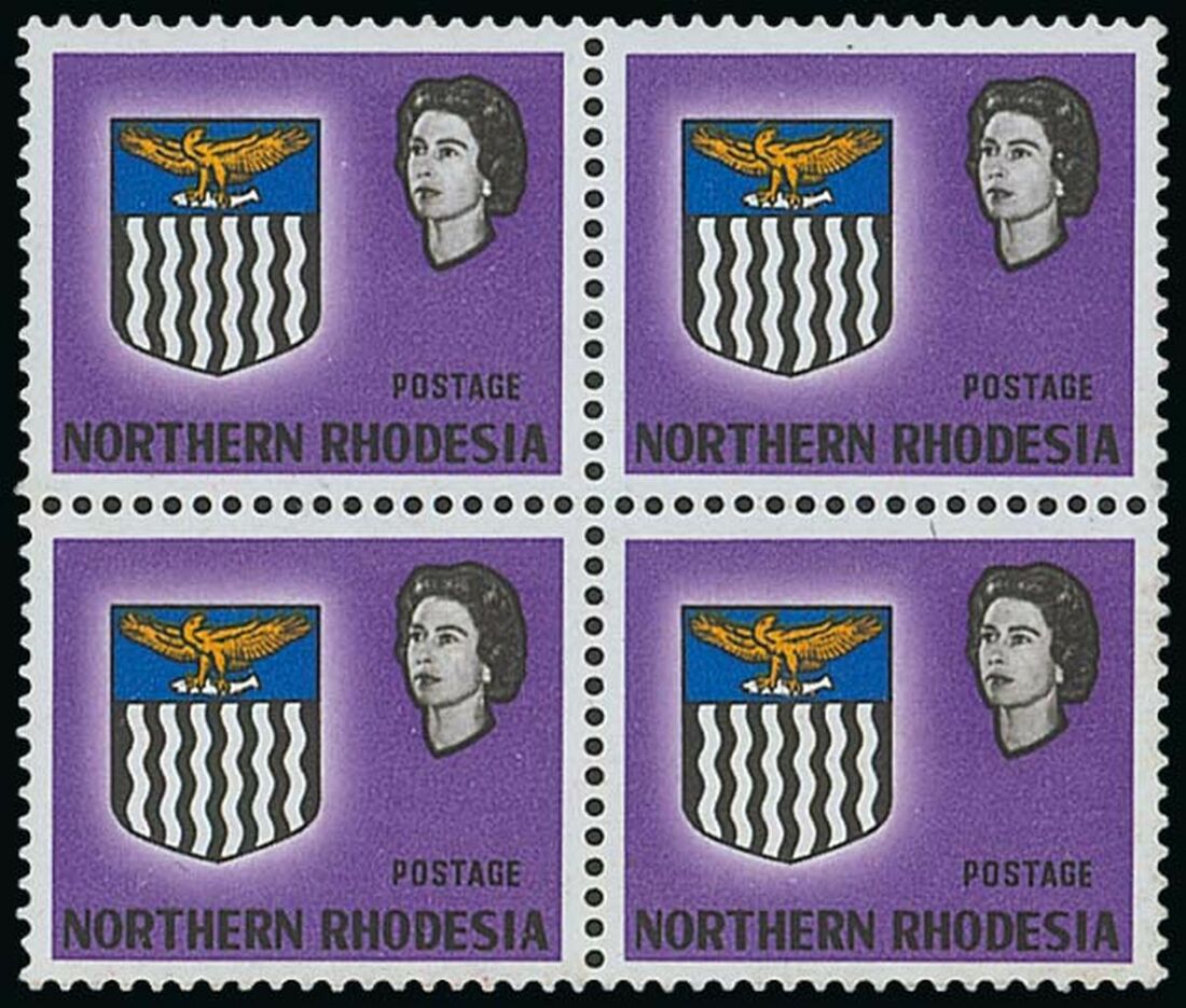 1963 (Dec.) Arms ½d. bright violet block of four with value omitted, fine unmounted mint. A very rare multiple. S.G.75a, £5,200. Photo