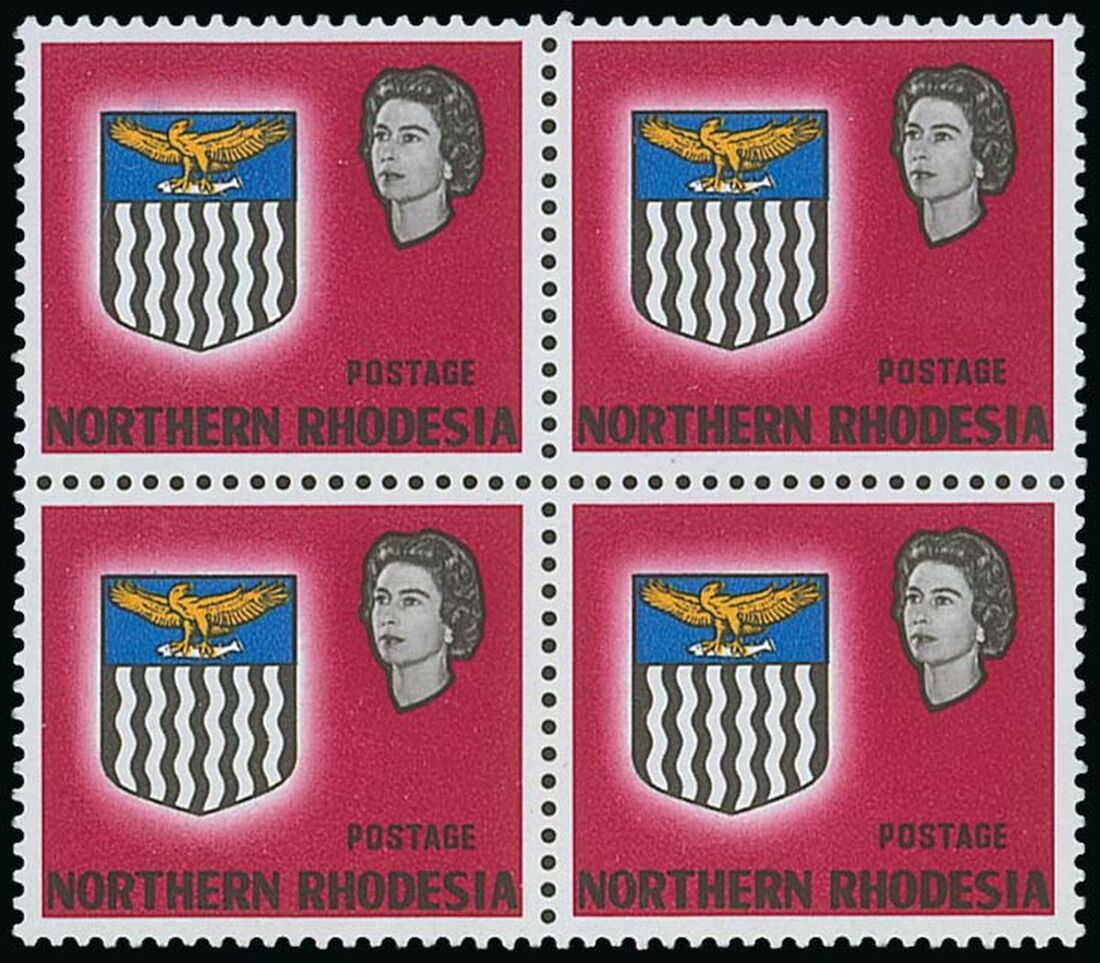 1963 (Dec.) Arms 5/- magenta block of four with value omitted from the sole sheet recorded, fine unmounted mint. A wonderful showpiece multiple from by far the rarest of all the value omitted errors. S.G. 86a, £12,000+. Photo