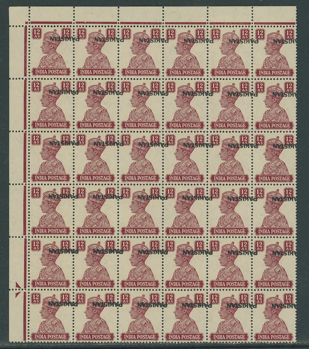 1947 (1 Oct.) 12a. deep crimson corner marginal block of thirty-six from the upper left of the sheet, each with overprint inverted, unmounted mint, a touch gum toned though a remarkable multiple, believed to be the largest known.