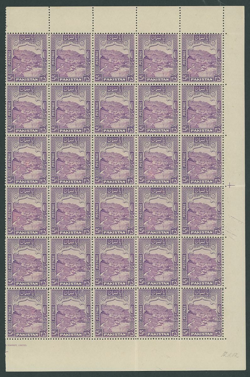1948-57 25r. violet, perf. 12, a complete half sheet of thirty (5x6) with part imprint at foot; one or two folds along perforations as to be expected, light bending through the left-hand column otherwise fine, unmounted mint and a scarce multiple. S.G. 43a, £1,350+