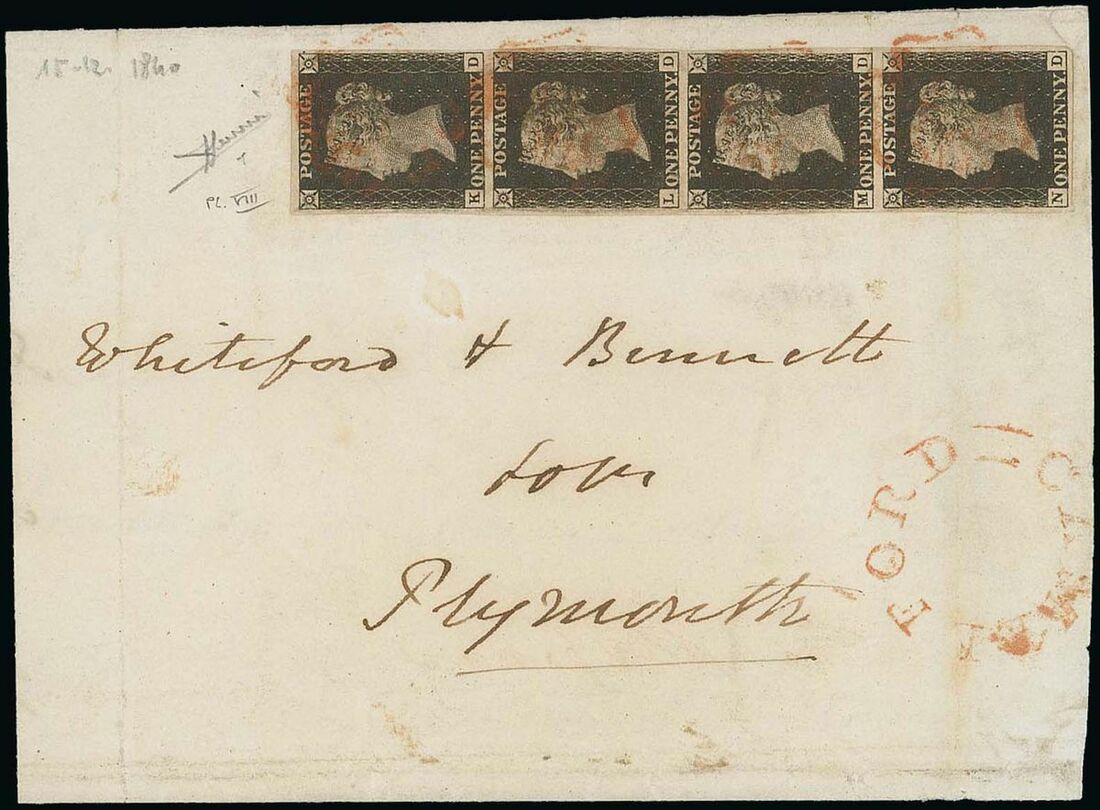 KD-ND vertical strip of four, all with four good margins, tied to entire letter from Camelford to Plymouth by strikes of red Maltese cross cancellation, red