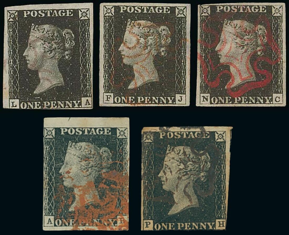 A group of five examples (5) all with Maltese Cross cancellations, comprising Pl.2, FJ with large to very large margins all round; Pl 6 examples (3) LA, NC and AB with mixed margins and Pl. 8, PH with some faults, mixed condition but some with fine and fresh appearance