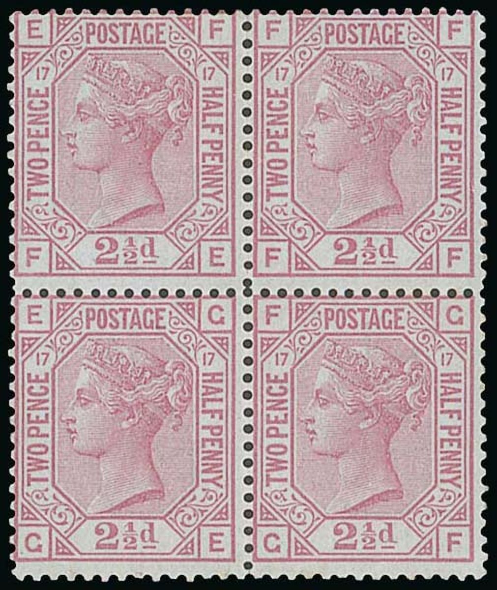 2½d. rosy mauve, Pl. 17, block of four lettered FE-GF, large part original gum; a scarce multiple of this difficult plate. S.G. 141, £6,800+