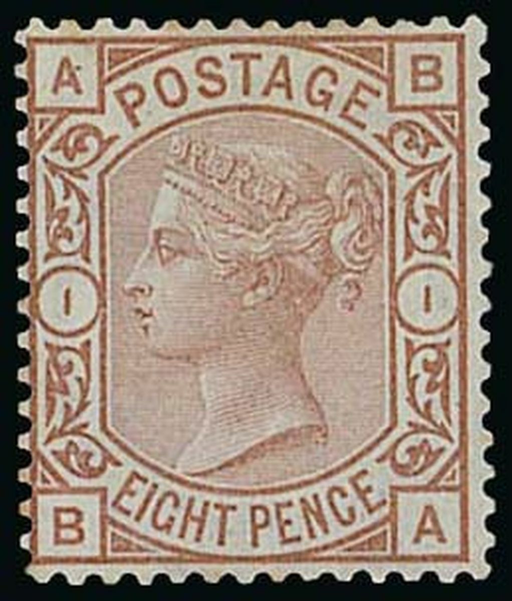 8d. purple-brown, prepared for use but not issued, Pl. 1, lettered BA, pressed crease at foot and a couple of minute peripheral tone spots at top; rare. B.P.A. Certificate (2013). S.G. 156a, £6,000