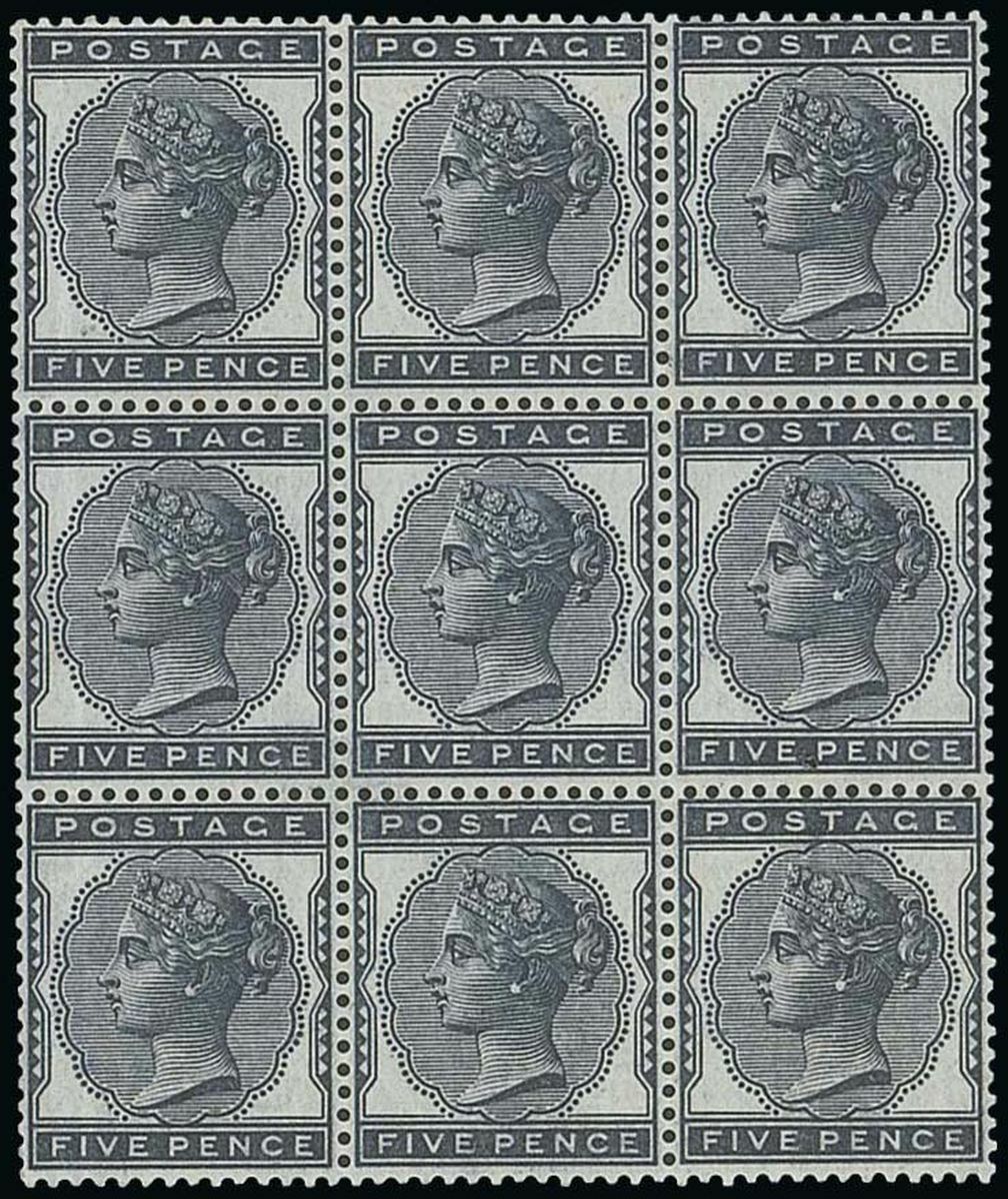 1880-81 5d. indigo, block of nine, fine and fresh mint with the lower two rows remaining unmounted; a scarce multiple. S.G. 169, £6,500+