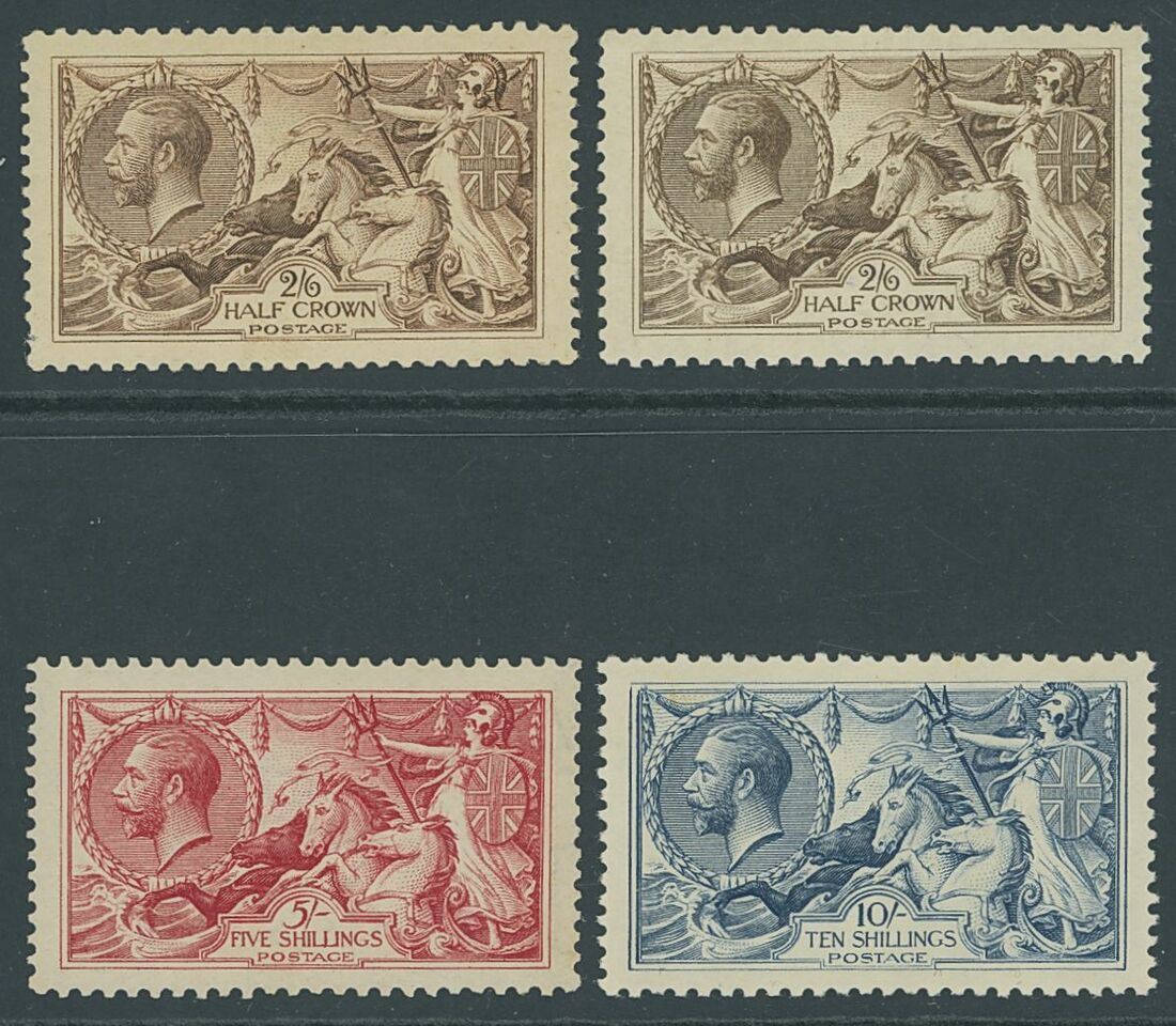 1918-19 Bradbury Wilkinson group of four comprising 2/6d. (2) in two distinct shades and 5/- rose-red and 10/- dull grey-blue; lightly mounted mint. S.G. 414/417 group