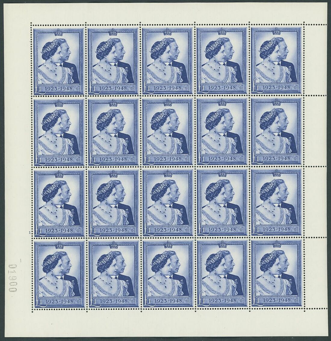 1948 Silver Wedding £1 blue, complete sheet of twenty with current number '01900' at lower left; unmounted mint. S.G. 494, £800+