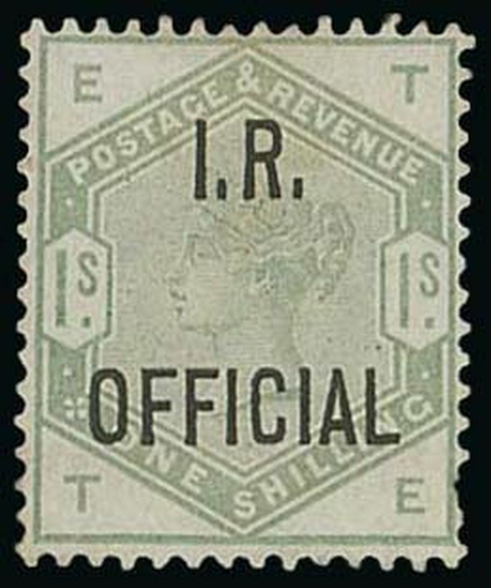1885 1/- dull green, a couple of slightly short perfs. and colour washed as often found with this issue, unused without gum; a presentable example of this rare stamp. Brandon Certificate (2002). S.G. O7, £6,000