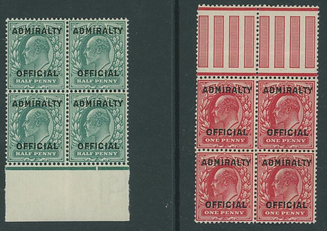 1903 (1 Apr.) ½d. blue green and 1d. scarlet, each value in a marginal block of four, overprinted Type 11, large part original gum. S.G. O107, 108, £480+