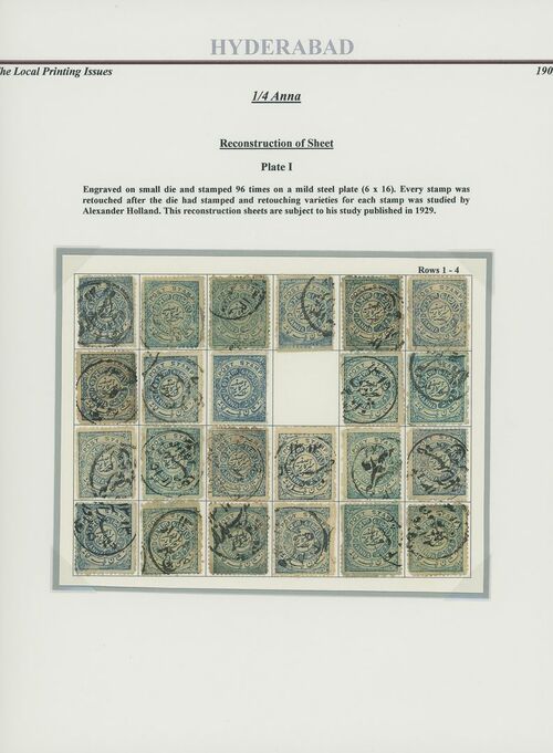 ¼a. blue Plate I and Plate II sheet reconstructions arranged on six exhibition pages, almost complete for Plate I (only three positions missing) and complete for Plate II, mainly used stamps with some shades and different cancels. Mixed condition as expected, a rare opportunity to acquire such a complete reconstruction. S.G. 21
