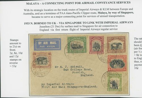 1933 (21 Dec.) envelope from Jesselton to UK, marked "By Imperial Airways, First Air Mail Singapore-London", franked at 53c. (10c. overpaid) and showing arrival datestamp on reverse