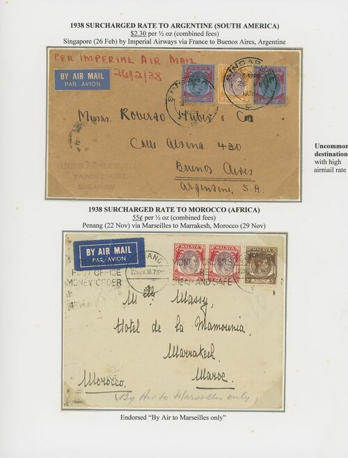 1936 (20 Sept.) envelope from Ipoh to Germany franked at 42c.; 1938 (8 July) envelope from Perak to Denmark franked at 42c.; 1939 (24 Feb.) postcard from Perak to Denmark franked at 25c.; (27 Feb.) envelope from Perak to Denmark franked at 42c.; (8 Mar.) envelope from Ipoh to Denmark franked at 45c.; (11 Mar.) envelope from Ipoh to Germany franked at 42c.; 1938 (26 Feb.) envelope from Singapore to Argentina franked at $2.30; (22 Nov.) envelope from Penang to Morocco franked at 55c.; (5 Dec.) picture postcard from Utan Melingtan (Perak) to Denmark franked at 25c.; 1939 (3 July) envelope from Penang to Paris franked at 45c.; and (25 July) envelope from Sabak Bernam to Sweden franked at 42c. (3c. underpaid). A useful lot