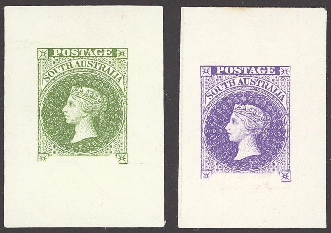 Perkins Bacon reprinted die proofs taken from the original die with blank value tablets, in green and in violet on thin card, fineR