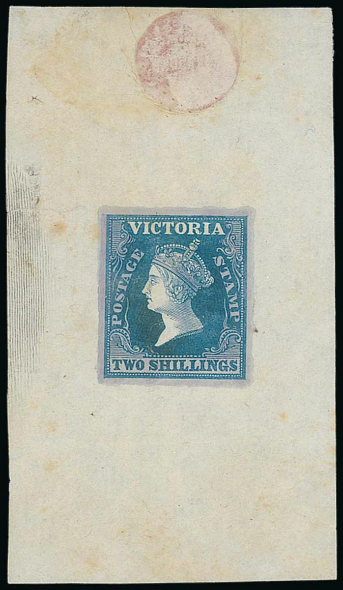 1854-59 Woodblock 2/- original printed essay in blue slightly larger than the adopted size (20x24.5mm.) showing an unadopted head of the Queen with Gothic crown, and with lilac background wash, on thin paper (48x84mm.). One of two similar essays and a beautiful example of Samuel Calvert's engraving. A major rarity of this issue and one of the most important Australian Colonial essays in private hands. Photo