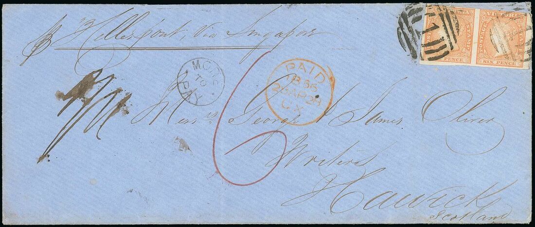 1856 (16 Feb.) double rate envelope from Melbourne to Scotland, marked "p Hellespont via Singapore", bearing 1854 Woodblock imperf 6d. dull orange pair [47-48] tied by Barred Numeral "1", showing manuscript "1/11" and "6" in red, circular-framed