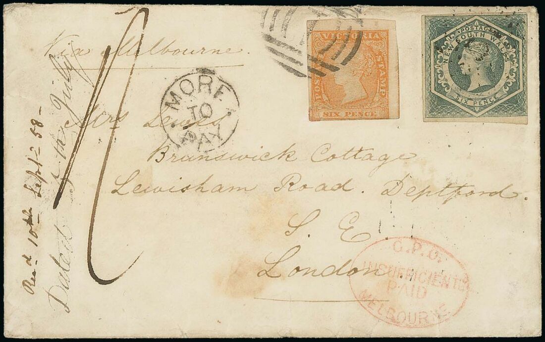 1858 (7 July) envelope from Deniliquin (NSW) to London, marked "via Melbourne", bearing 1854 Woodblock imperf 6d. dull orange [27] tied by Barred Numeral "1", in combination with New South Wales Diadem imperf 6d. cancelled by "51" in rays, showing oval-framed
