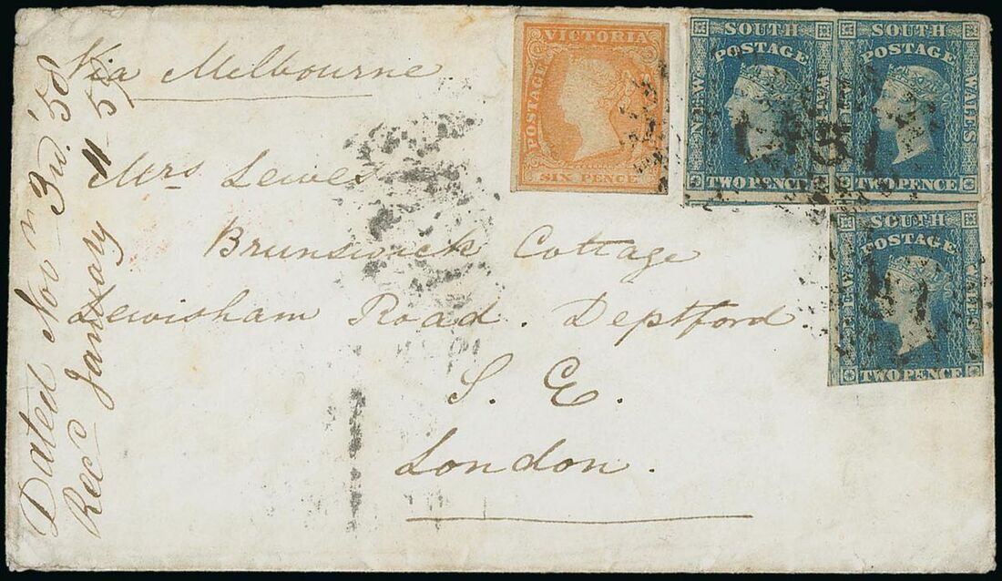 1858 (5 Nov.) envelope from Deniliquin (NSW) to London, marked "Via Melbourne", bearing 1854 Woodblock imperf 6d. dull orange [6] in combination with New South Wales Diadem imperf 2d. pair and single (two stamps with small faults), all cancelled by "51" in rays and showing, on reverse, despatch, Melbourne and arrival (11.1) datestamps. Most unusual since almost all Riverina mail from Deniliquin left the Victorian stamps for cancellation in Melbourne. B.P.A. Certificate (1992). Photo