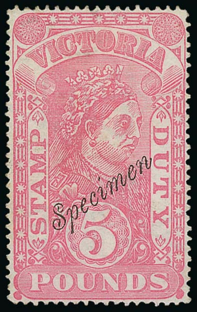 1879-96 Stamp Duty Typo, perf 12 £5 rose-pink diagonally handstamped "Specimen" (Type 14), well-centred brilliant colour and extremely fine. The only recorded example. S.G. 278. Photo