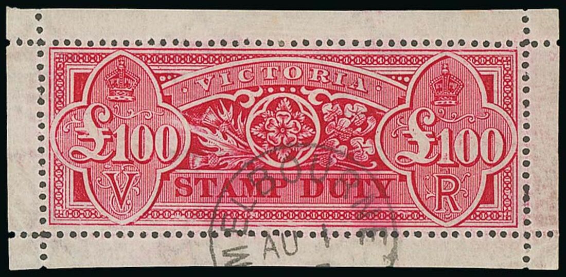 1884-1900 recess, watermark Type 33, £100 aniline crimson with margins on all sides, cancelled to order (1.8.97) and with large part original gum, Ceremuga Certificate (2014) "Superb example". S.G. 285c. £1,800+. Photo