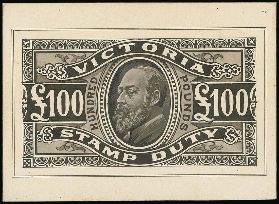 1905 KEVII £100 Stamp Duty, composite essay hand painted in Indian ink and grey wash, touched up in Chinese white on thin card (113x82mm.), the portrait inserted into the central vignette; small pinhole at top right. Unique and most delightful. Photo