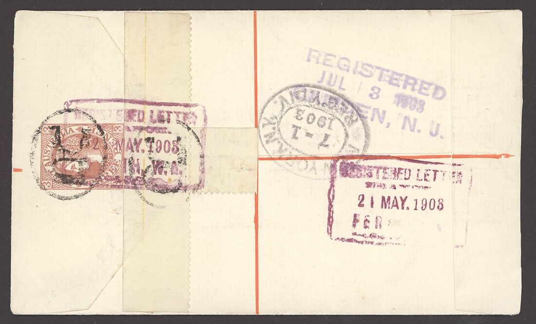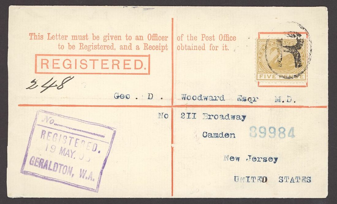 1903 (19 May) 3d. registered envelope from Geraldton to New Jersey, uprated with 5d. tied by "R" in oval, showing despatch registration datestamp in violet and, on reverse, Perth, New York and arrival datestamps, fine