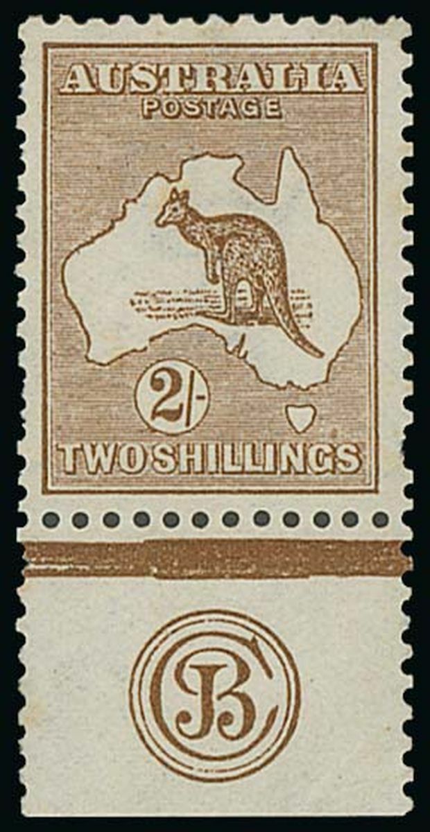 1913 First Watermark 2/- brown, lower margin showing JBC monogram, well centred, large part original gum, a few short perfs. otherwise fine and very rare. NPC certificate (2019). S.G. 12var; B.W. 35Azc, $25,000. Photo