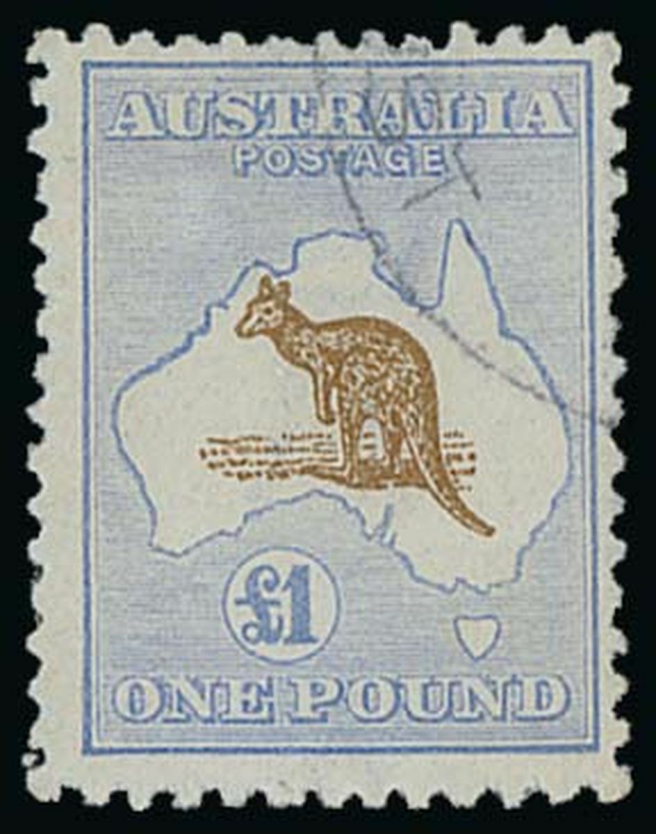 1915 Third watermark £1 chocolate and dull blue, slightly centred to upper right, fine and lightly cancelled. S.G. 44, £1,600. Photo