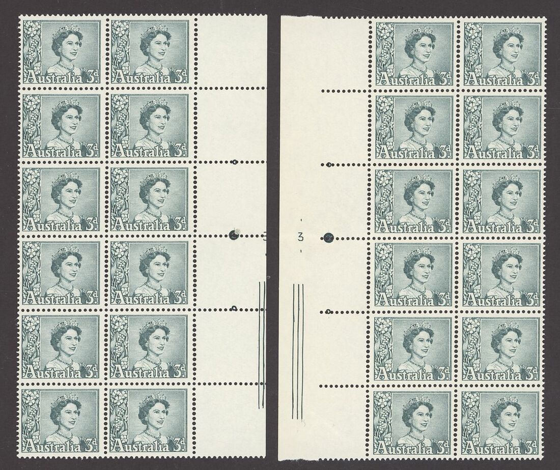 1959-63 3d. blue-green left and right marginal coil perforation blocks of twelve (2x6) showing complete and part plate number "3" respectively, fine unmounted mint. S.G. 311b; BW 350z, 350zc