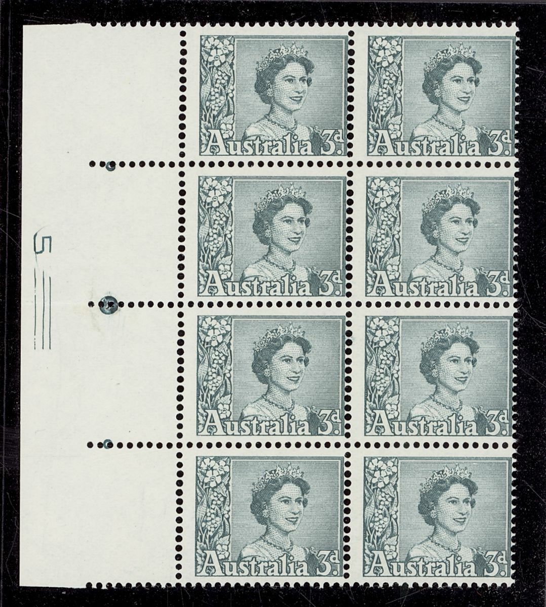 1959-63 3d. blue-green left marginal coil perforation block of eight (2x4) showing plate number "5", fine unmounted mint. S.G. 311b; BW 350zg