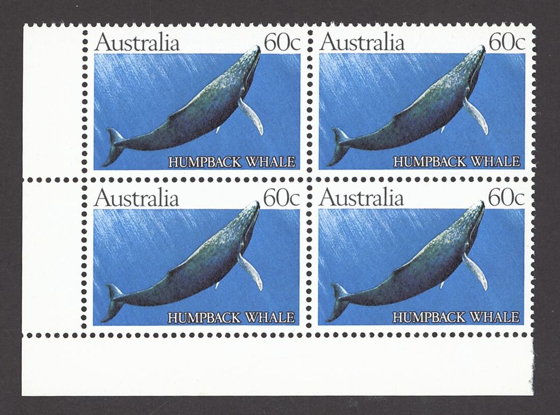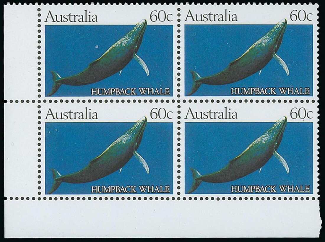 1982 (Feb.) Whale 60c. lower left corner block of four with solid greenish blue background, fine unmounted mint. With matching normal block for comparison. S.G. 841a, £1,000. Photo