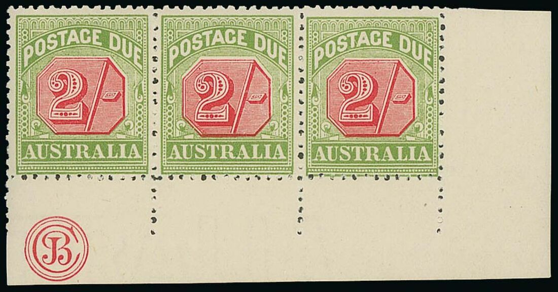 1902-10 2/- rosine and yellow-green lower right corner strip of three with "JBC" watermark, fine unmounted mint. S.G. D70; BW D89zb. Photo