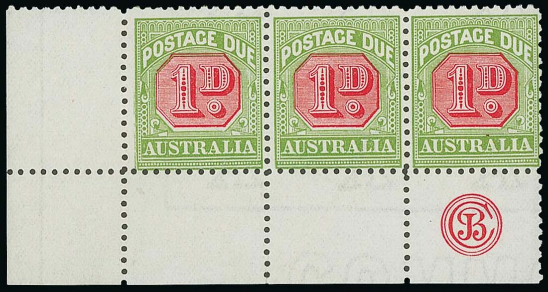 1913-23 thin paper, perf 11 1d. rosine and bright apple-green lower left corner strip of three with "JBC" monogram, fine unmounted mint. S.G. D78; BW D96z. Photo