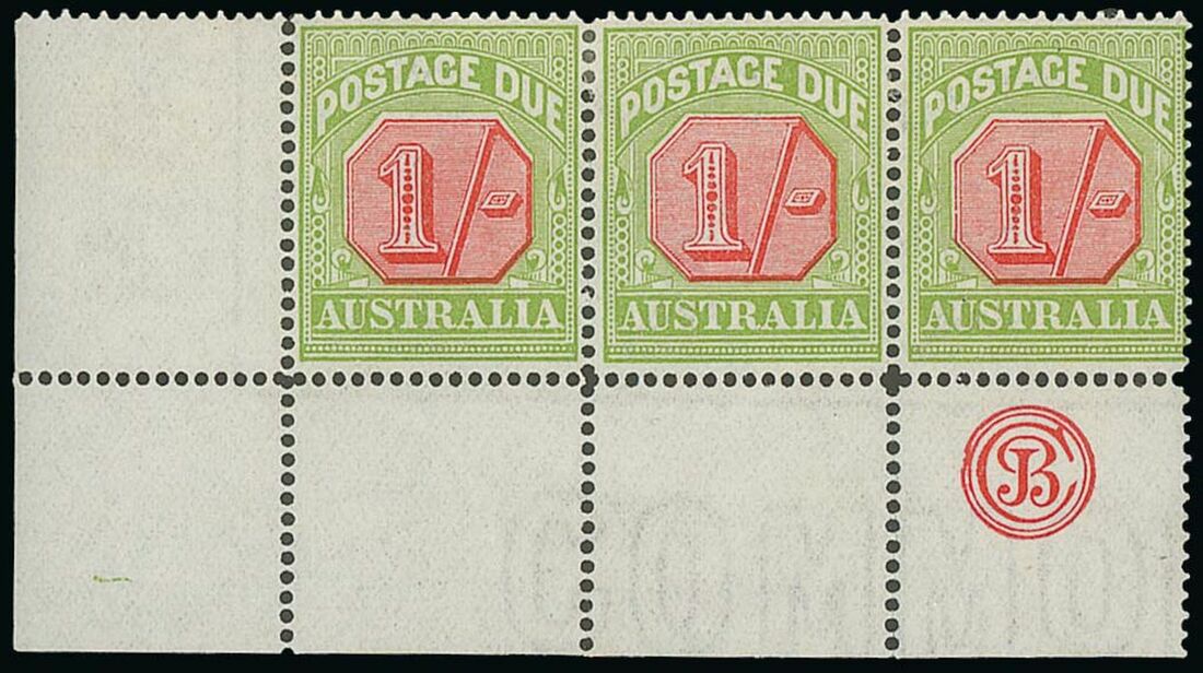 1913-23 thin paper, perf 14 1/- scarlet and pale yellow-green lower left corner strip of three with "JBC" monogram, fine mint. S.G. D85; BW D102z. Photo