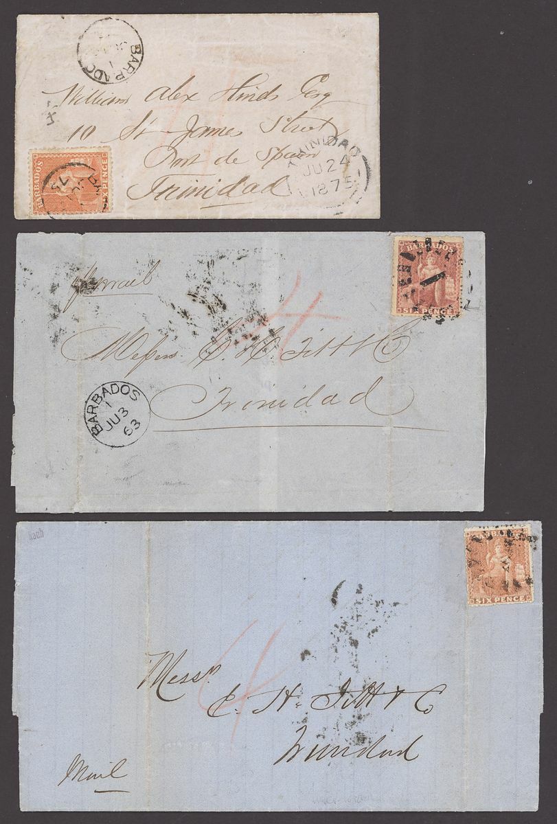 1863 (3 June) near complete entire, rated "4" and bearing 1861 6d. rose-red cancelled with bootheel "1" and with superb despatch datestamp at left, arrival datestamp (damaged) on reverse; 1866 (18 Aug.) entire letter from Bridgetown to Messers. Fitt & Co., rated "4" and bearing 1861-70 6d. orange-red lightly cancelled with bootheel "1", despatch "1" datestamp on reverse; and 1875 (June) small envelope to Port of Spain, rated "4", bearing 1873 clean-cut perf. 6d. orange-vermilion cancelled by datestamp and with a further strike at top and arrival datestamp (24.6) at right. An interesting trio of covers addressed to Trinidad