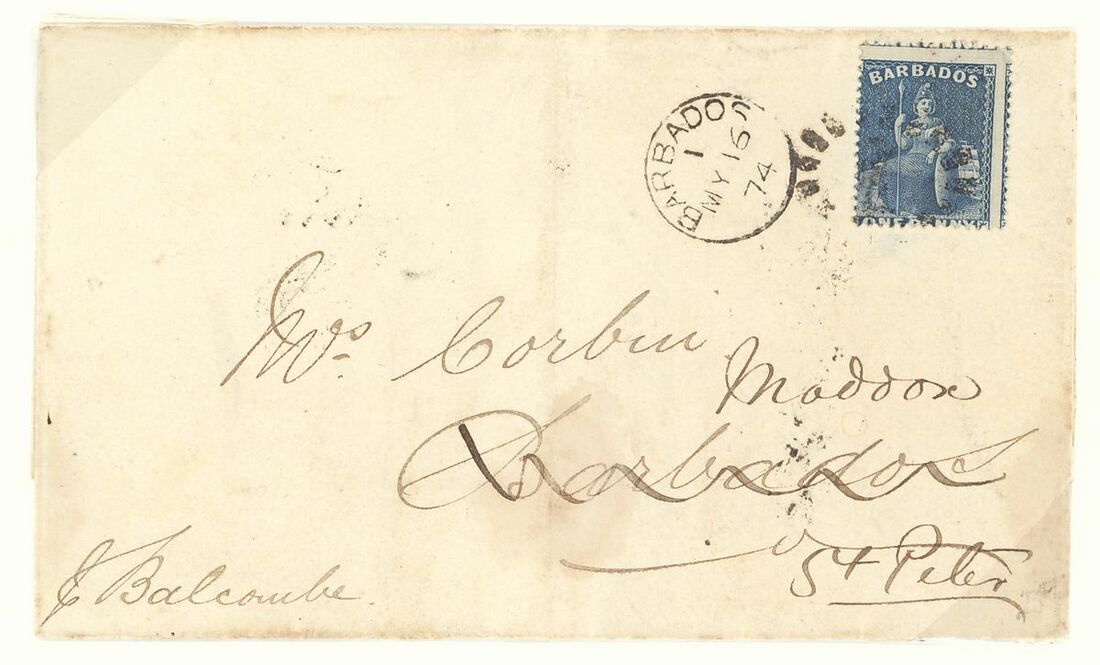1874 (16 May) consignee entire carried by private ship "Balcombe" to Barbados and on arrival forwarded to destination "Maddox St. Peter", bearing 1874 perf. 14 (1d.) deep blue with light bootheel "1" and with code "1" despatch datestamp alongside, a further indistinct datestamp (17.7?) on reverse. One of only two consignee covers recorded and the earliest recorded date of use of this 1d. value